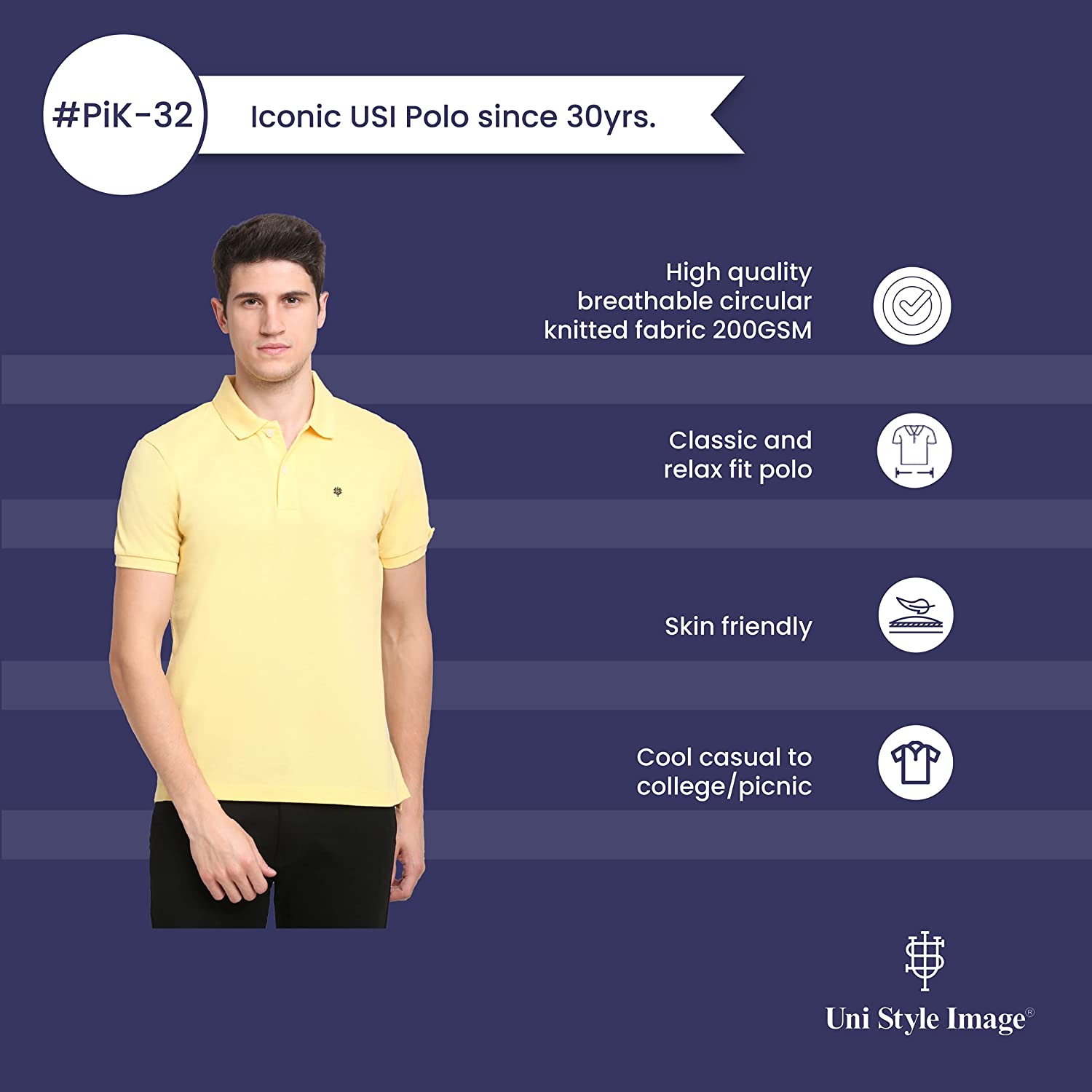 USI Pik 32 polo is made of Fabric which is Durable and has incredible strength. This keeps you fresh and crisp throughout the day. It is comfortable and adjustable with high quality cuffs. This polo also has a longer back to help you tuck in your polos. Our fabric has undergone extensive testing to ensure that it is Skin friendly and has Minimal Chemicals. The Per wear cost of USI Pique is very low, doing less damage to the soil. Comfort and Style go hand in hand with these Polo's. This product is made in American fit with breathable Cotton fabric. All components used to make this product are environment friendly. By using this product you are moving one step closer to save the environment. USI Pique Polo is best paired with Chinos, Knit Pants, Woven shorts or your favourite pair of Denims.