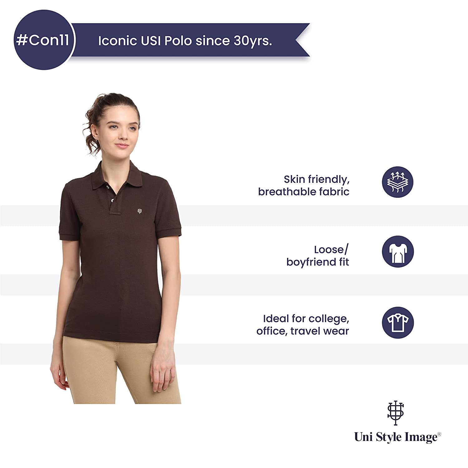 USI Women's Con-11 is made of Fabric which is Durable and has incredible strength. Usi Polo keeps you fresh and crisp throughout the day. Our fabric has undergone extensive testing to ensure that it is Skin friendly and has Minimal Chemicals. The Per wear cost of USI Con-11 is very low, doing less damage to the soil. Comfort and Style go hand in hand with USI Women Polo's. This product is made in Smart fit with breathable Cotton fabric. It is the best Classic Polo for you. All components used to make this product are environment friendly. By using this product you are moving one step closer to save the environment. USI Con-11 Polo is best paired with Chinos, Knit Pants, Woven shorts or your favourite pair of Denims.